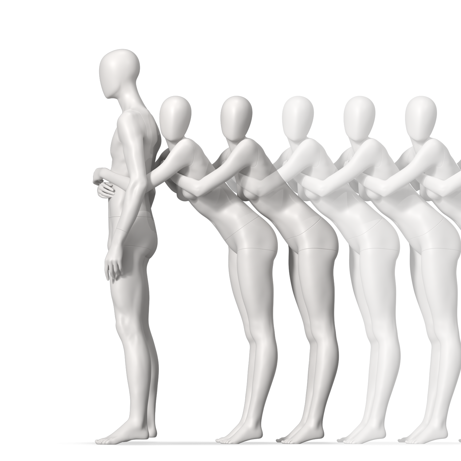 The first two male and female mannequins are placed on a 42cm (16,5in) round glass base with a silver chrome calf pin, inserted in a silver chrome calf block. The remaining female huggers are placed on a rectangular 35cm x 27cm (13,7in x 10,6in) rectangular glass base with a silver chrome calf pin, inserted in a silver chrome calf block.